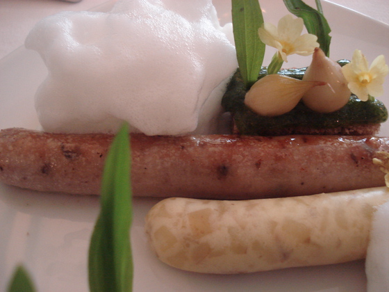 Salchicha de conejo asado con morillas y cebolla y salchicha de patatas con leche de primavera, pesto de prímulas y brioche con granos de grosella