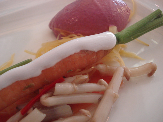 Zanahoria de primavera cocida con agua de rosas y zanahoria cocida con flores de naranja.Helado de leche de cabra con remolacha.Brotes de lúpulo con aceite de avellana. Fideos de rutabaga amarilla confitados con leche y chiles