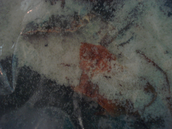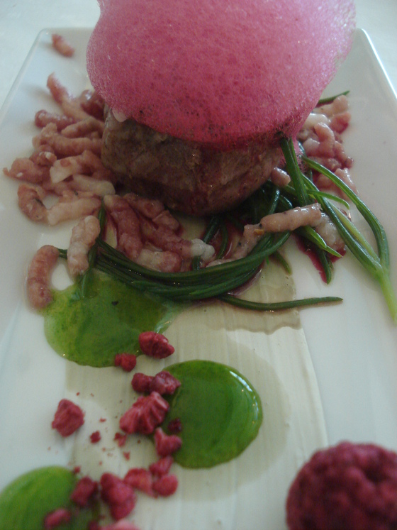 Filete de cerdo de raza mangalica (cerdo de lana) asado en su propia grasa y confitado con vino moscato, canela, clavo. (Se presenta sobre una banda de arcilla blanca, se acompaña de quinoa y se cubre con espuma de remolacha)