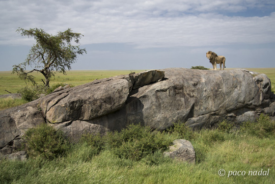 Un viejo león macho vigila sus dominios desde un kopje, una afloración de granito típica del Serengeti.Los guionista del Rey León tuvieron que inspirarse en una imagen parecida a ésta.