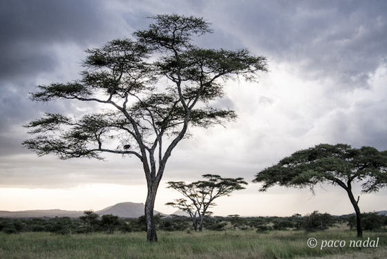 Solo las acacias ponen una nota vertical en el plano infinitamente horizontal de la sabana.