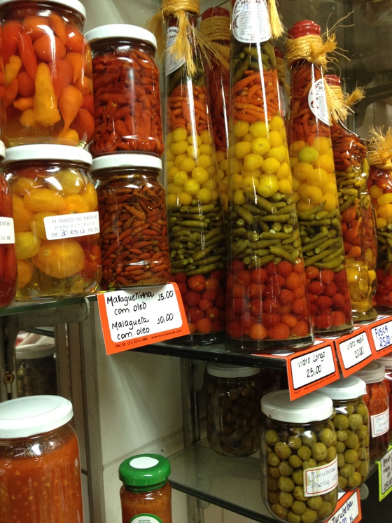 Paraíso das pimientas: Pequeño comercio atiborrado de pimientas frescas y en conserva. En Brasil los ajíes peruanos y los chiles mexicanos adoptan la forma bolitas arrugadas con puntos de picor variables. Más de 30 tipos de la variedad “capsicum annuum”. Pregunté y me facilitaron nombres: cumarí, las rojas; brode, amarillas; malaguetas, las de picor terrorífico, semejantes a guindillas.