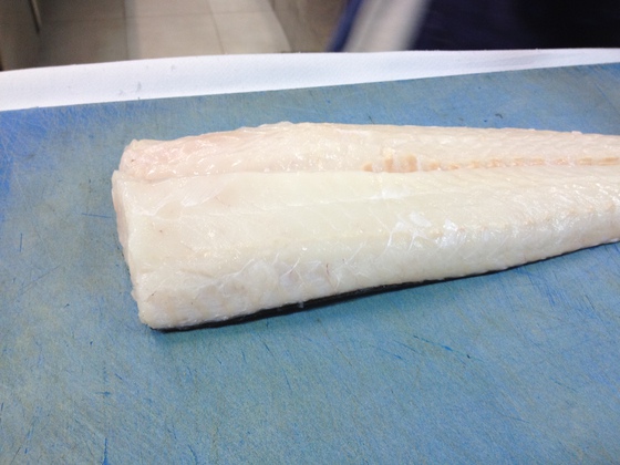 1) Se retira la piel de un lomo limpio de una merluza (pescadilla gruesa de 2,5 kg o algo más)