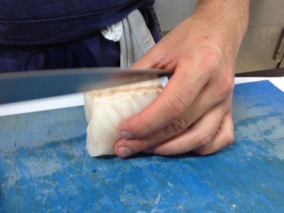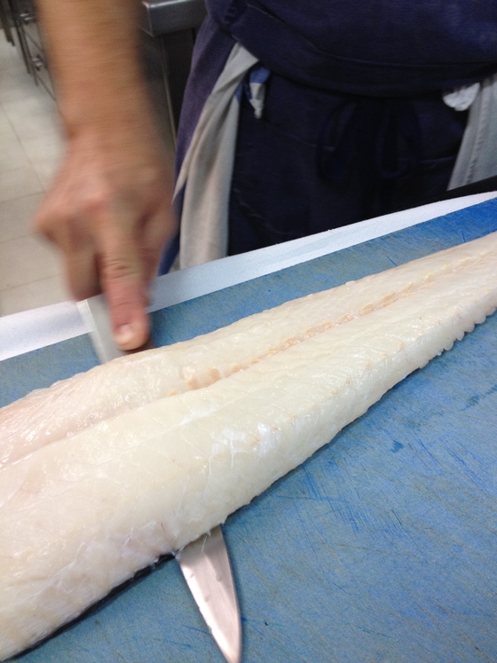 2) Se corta el lomo en tres trozos de cuatro dedos y se reserva la cola para otros platos. Paniego equipara cada lomo de merluza a un solomillo de vacuno del que es posible extraer el chateaubriand, el tournedó, el centro y el filet mignon (cola del pescado)