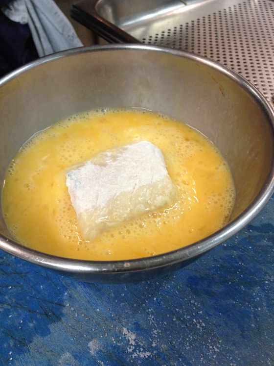 4) Sigue el enharinado, rebozado en huevo batido y escurrido de los tacos.