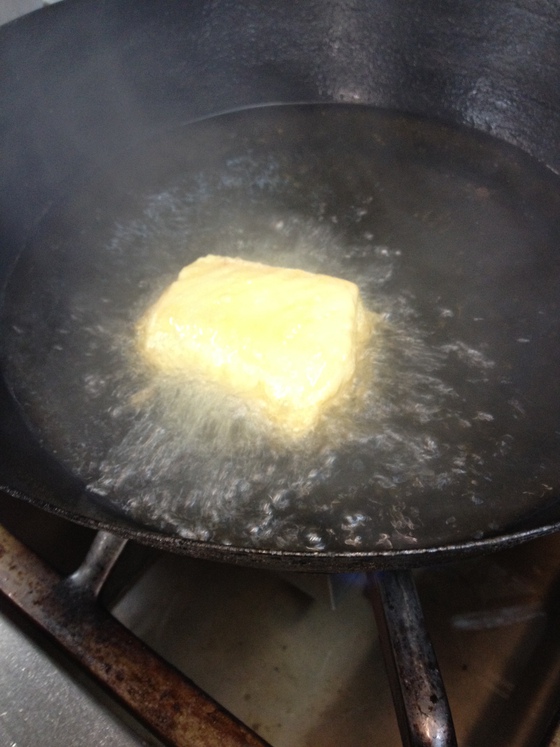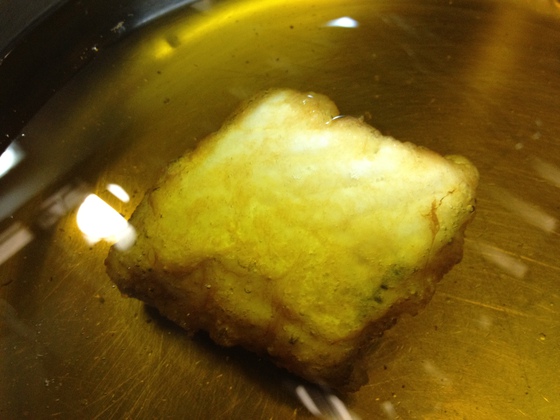 5) Primera fritura fugaz en aceite de oliva humeante muy caliente 200º C, 10 segundos por cada lado