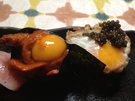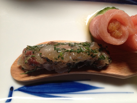 En este caso se trataba de esos sashimis (usuzukuris) que Ricardo aliña como si fueran tiraditos, los makis con huevos fritos y caviar, los makis que envuelve en lechuga de mar en lugar de alga nori, y el toro que recuerda el jamón ibérico con pan con tomate. Ganó Ricardo Sanz, pero en Japón habría barrido Imada.