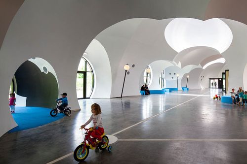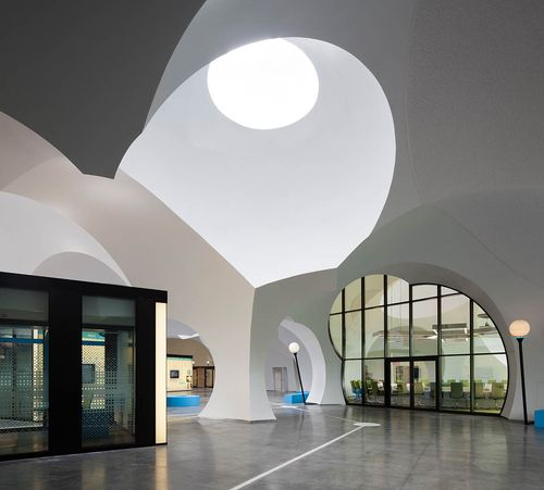 La cubierta fue construida con encofrados inflables que también minimizaron el consumo energético y los desechos. Tal vez por eso, los arquitectos explican que esa cubierta funciona como una nube. Y está llena de sorpresas. Tiene, por ejemplo, un “sol artificial” que aprovecha el fuerte viento exterior para alimentar los leds que lo iluminan.