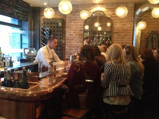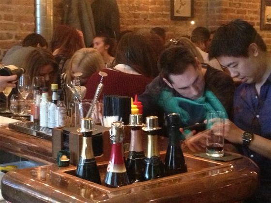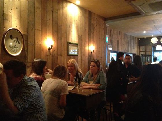 Las fotos que acompañan esta entrada son bastante malas. Carecen de luz y están medio borrosas. Eso sí, reflejan el ambiente del local en penumbra con mesas altas y taburetes incomodísimos donde una clientela joven se apretuja entregada. Un cuchitril neo chic que ha conectado con cierto público londinense.