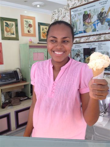 A media mañana probé un fantástico helado de uchuba (alquequenje) en la heladería Paradiso, que me había recomendado mi amiga Cristina Botero. Luego un jugo (zumo) de maracuyá en la pastelería Mila (www.pasteleriamila.com) y después por el equivalente a 1 euro el agua de un coco cortado a machete. Hasta le compré un banano a una palenquera para que me dejara hacerle una foto.