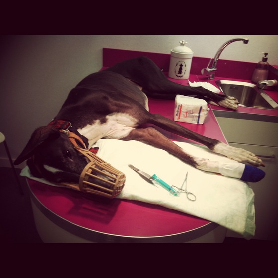 El perro, esclavizado con una campana isabelina 18 horas al día, con la que no sabe ni andar ni sentarse porque no tiene visión lateral. El primer día consigue quitársela y se come todos los puntos. Y ya no se los pueden coger de nuevo, no hay carne suficiente. “Bueno, tardará más en cerrarse y quedará más feo, pero cerrará. Cuidado con que no se le infecte”. Un mes y medio con curas, vendas... Todo por un cristal de una botella de whisky que un joven rompió. Pero Coco no es ni mucho menos un caso único. Cualquier perro que salga habitualmente a pasear por parques donde se celebran botellones, se corta una media de una o dos veces al año.