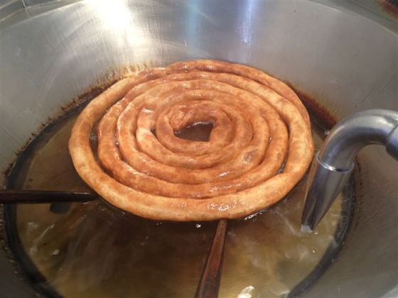 Cuando el aceite alcanza los180 /190 ºC Saravia abre el grifo desde el que deja resbalar el chorro al que imprime un movimiento de rotación con la ayuda de grandes palillos.