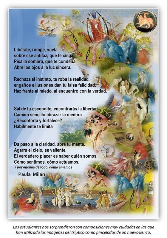 Con los estudiantes de 2º de Bachillerato, el nivel de exigencia fue mayor. Se les pidió que buscaran un detalle del cuadro, que les pareciera lo suficientemente sugerente como para construir un texto literario, poema o no, en el que estuviera presente la función poética. Además, se les pidió que acompañaran su texto con imágenes del tríptico de forma que estuvieran en perfecta relación, embelleciéndolo.