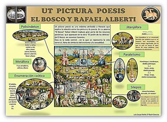 Se incorporan trabajos que tienen como punto en común: establecer relaciones entre pintura y poesía. Para transitar por este camino contamos además de con El Bosco, con la presencia de un poeta, Rafael Alberti, cuya primera vocación fue la de pintor; quizá por eso, en el exilio, escribió un libro de poemas llamado A la pintura, cuya parte tercera es una bella alabanza al Museo del Prado, -según sus palabras- uno de los museos más bellos del mundo.