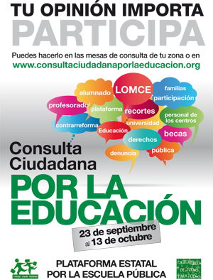 Han surgido también en España decenas de organizaciones de defensa de la educación pública, como Ciudadan@s por la Escuela Pública, que se articulan y promueven iniciativas con otras ya legendarias, como la Asociació de Mestres Rosa Sensat y la Confederación de Movimientos de Renovación Pedagógica. Hay, además, centenas de organizaciones regionales y locales que producen sus propias estrategias y se unen a movimientos de alcance nacional, como la Consulta Ciudadana por la Educación Pública, que comienza el 23 de septiembre y se extenderá hasta el 13 de octubre.