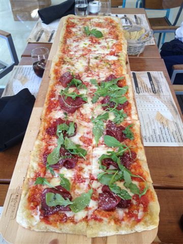 “Se trata de la primera pizzería en Europa, que sirve pizzas de dos metros de largo”, pregonan a bombo y platillo. Más aún, “Se cocinan en el horno de pizzas mas grande del mundo”