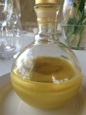 Ya en la mesa se sirven con patatas y se bañan con aceite de oliva de Orense, marca Aouris. Tampoco un aceite de cualquier tipo sino un AOVE que ya no lo es en el momento de utilizarlo porque se ha teñido previamente con polvo de oro comestible o una sustancia dorada similar en alusión a las milenarias minas de oro explotadas en la región por los romanos. Oro, Aurensis, Ourense, Orense.