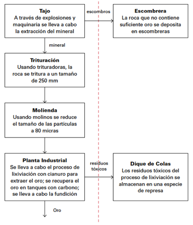 Una vez se tiene la roca, se clasifica en: escombros y mineral. Los escombros no contienen mucho oro, mientras que el mineral es roca que contiene suficiente oro para ser procesado. Los escombros son dejados en escombreras y el mineral es triturado hasta convertirse en polvo. Después, éste es mezclado con agua y productos químicos, como el cianuro, para poder separar así el oro del resto de los minerales.