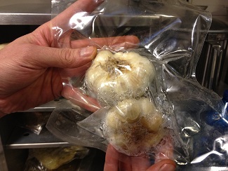 “Tienen umami y potencian otros sabores. Pero como me resultan caros los elaboro yo mismo”, asegura. “Utilizo los mini arcones de calor que se emplean para transportar el room service. Envaso las cabezas enteras al vacío con levadura de cerveza y dejo que fermenten con calor suave a 65 ºC. Tan sencillo como eso. Estoy haciendo pruebas también con los dientes de ajo ya pelados, a ver los resultados”.