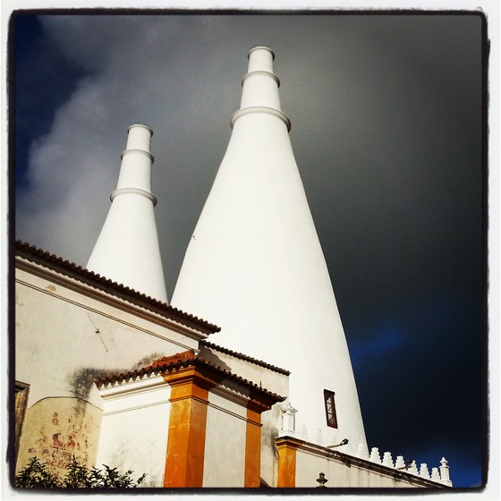 Desde aquí arriba, entre las almenas de la torre Real, se obtiene una vista maravillosa del excéntrico palacio da Pena, recortado sobre otra colina de rocas redondeadas; del océano Atlántico, que allá a lo lejos crea una línea blanca de espuma cuando choca con el continente, y del pequeño núcleo histórico de Sintra, que parece un puzle de tejados rojos abrazando las dos características chimeneas blancas del palacio nacional, el icono de Sintra.