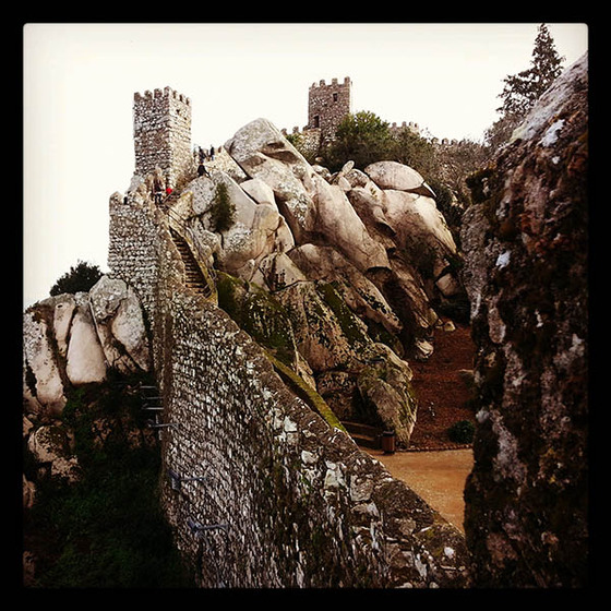 Y luego hay que subir por empinadas cuestas enclaustradas entre muros de piedra comidos por el musgo y los líquenes hasta el castelo dos Mouros, antiguo fortín musulmán sobre un peñasco de domos graníticos que domina la sierra. Fue más tarde una fortaleza medieval cristiana hasta que D. Fernando II lo compró a la vez que el palacio da Pena y lo restauró (más bien, lo alteró) con una intervención exagerada muy del gusto romántico pero carente de toda ortodoxia histórica.