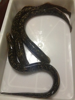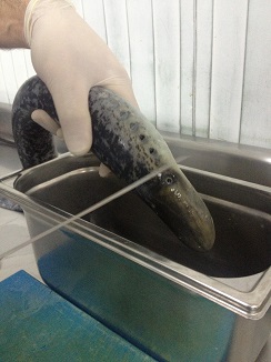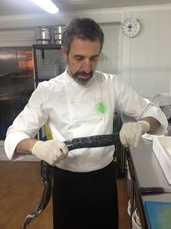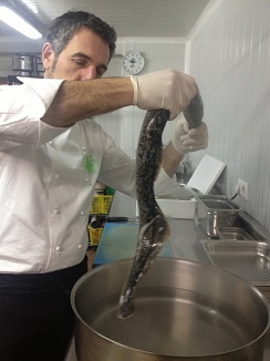 Después de escuchar sus interesantísimas explicaciones, nos “pescaron” una lamprea que nos llevamos viva en el coche hasta Casa Solla en Pontevedra.