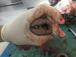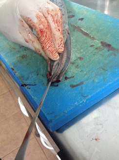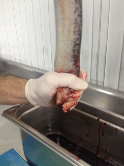 Escaldado fugaz y raspado de la piel para retirar el limo. Nuevo escalfado para repetir la operación. Tras el último enjuagado en agua limpia llegó el degüelle del pescado. Enseguida inrodujo un cuchillo a la altura de los orificios branquiales, junto al cuello.