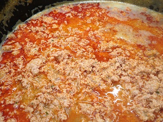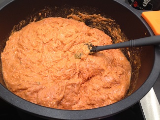 Para empezar, nos encontramos una cazuela llena de una crema rosácea, que parecía pasta untable. No era otra cosa que chorizo crudo triturado con caldo de pollo. “Emulsionamos la proteína con algo de líquido para que la albúmina pueda fijarse. Cuanto más triturada esté antes se disgrega”, insistió.