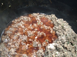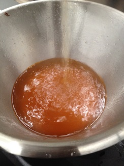 Ebullición lenta en abundante agua durante horas, con clarificación final hasta lograr por evaporación la concentración y el sabor pretendidos.