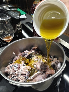 Por separado llenó otra olla con recortes de merluza, agallas, pieles y espinas. Añadió aceite de oliva y una porción de colatura di acciughe (jugo resudado de los barriles de anchoas, italiano). Hervor violento, y tras el filtrado surgió un aceite de merluza delicadísimo. “Lo podemos utilizar para un pil pil, para ligar cocochas, o para lo que nos dé la gana”.