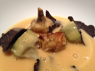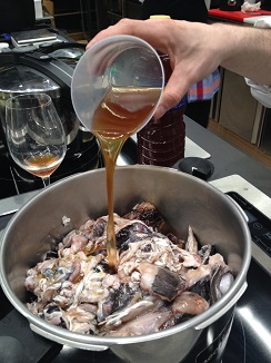 Y terminamos la clase con dos caldos de pollo y de liebre, concentradísimos, muy nobles, de gusto potente obtenidos por los mismos procedimientos.
