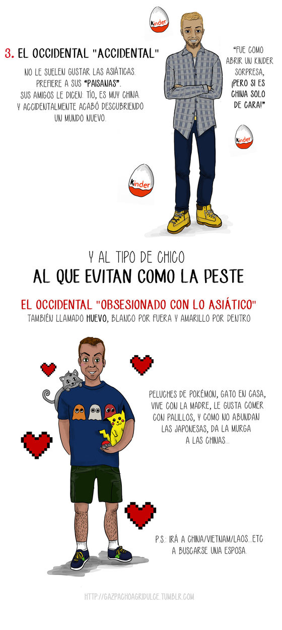 Me ha hecho gracia el del final. Conozco un calco, que hasta está aprendiendo japonés (a él le pasa con las japonesas, no con las chinas).A mí me gustan todas.. Chinas, españolas, japonesas... Luego las ves sin ropa y son todas igual de bonitas.