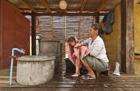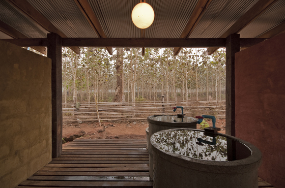 Por eso lo primero fue lidiar con los desechos, los conductos subterráneos, lo que no se ve. Lo segundo, ventilar. Los arquitectos decidieron cambiar el hormigón del pavimento por lamas de teca -el árbol que crece junto al orfanato-, más fácilmente lavables, levantar ese suelo sobre grava y crear un sistema de circulación de aire que ayudase a mantener ventilado y seco el baño de los niños. Entre dos muros de hormigón están encerrados los sanitarios, los agujeros, para ofrecer cierta privacidad a quien los usa. El resto, la zona de baños, “se adapta a las costumbres karen con áreas comunes para la higiene de las personas y el lavado de la ropa”, explican los arquitectos.