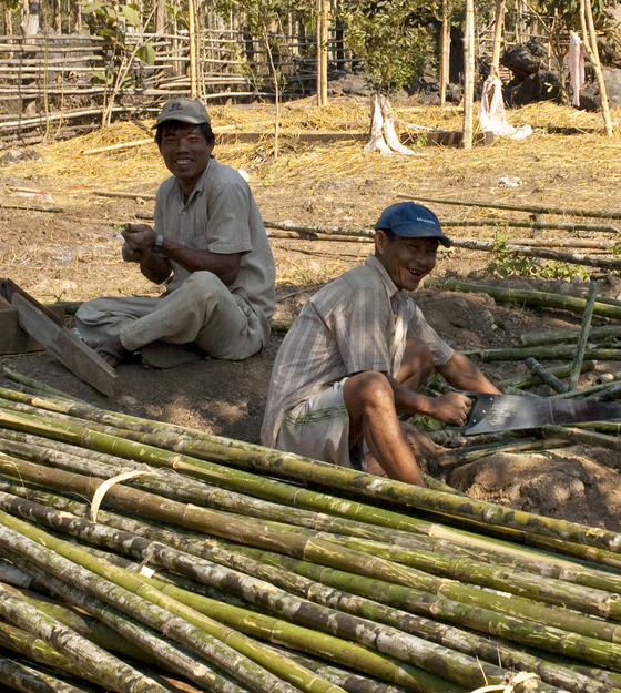 La casa de baños es un volumen rectangular que, como las viviendas de la zona, queda cubierta por una fachada de bambú que permite su ventilación e iluminación y confiere cierta intimidad además de unir las dos zonas del baño.