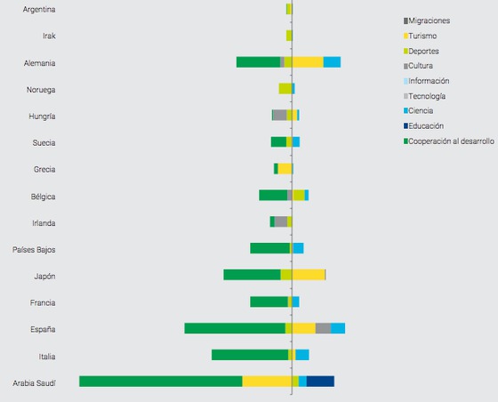 Pues bien, de acuerdo con la nueva edición del informe, publicada hace unas semanas, España está entre los seis países que más presencia internacional han perdido en el último año. La razón, ya lo habrán adivinado, reside en buena medida en el proceso de desmantelamiento (‘racionalización’, en el eufemístico lenguaje administrativo) que padece la Cooperación Internacional desde hace tres años (el gráfico adjunto expresa a izquierda y derecha, respectivamente, dónde han perdido o ganado algunos países en el último año). En la medida en que esta tendencia se cronifique o acentúe en el futuro, nuestro país irá perdiendo posiciones dentro de una Europa que se hace más irrelevante en sí misma.