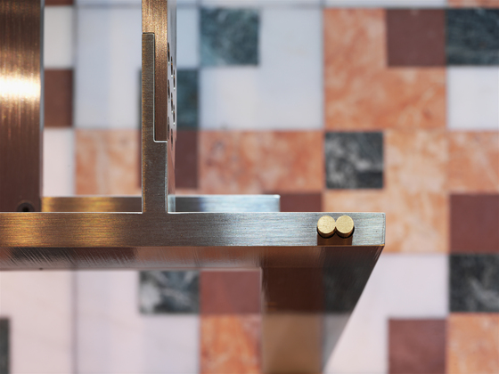 Detale de la mesa Doge con dos cilindros de latón que sujetan el sobre de vidrio