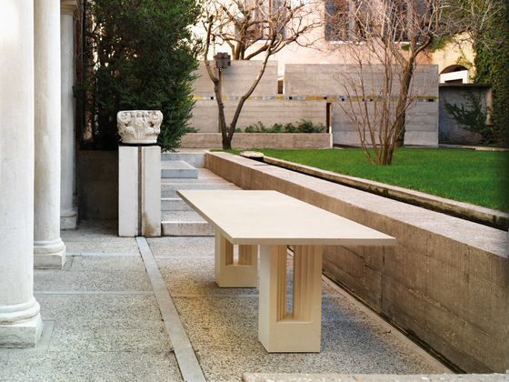 La mesa de mármol Delfi original era un trabajo conjunto de Scarpa y Marcel Breuer que este último le había regalado a Gavina. De mármol y sujeta con dos prismas monolíticos, Scarpa sugirió abrir esos monolitos, aligerar su presencia. En el jardín de la Fundación Querini Stampalia hay una fuente cuyo caño recuerda la manera en que esta mesa sujeta su sobre con piezas de latón. ¿Huevo o gallina? Scarpa es una figura de la arquitectura más exquisita de la que todavía se puede aprender cómo los detalles, en su justa y precisa medida, contribuyen a la suma del total del edificio.