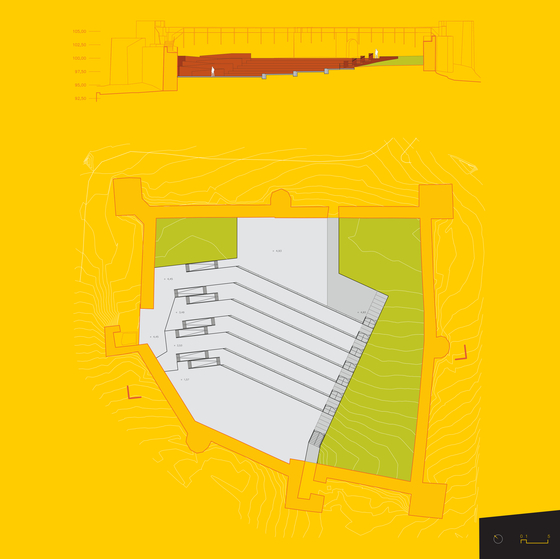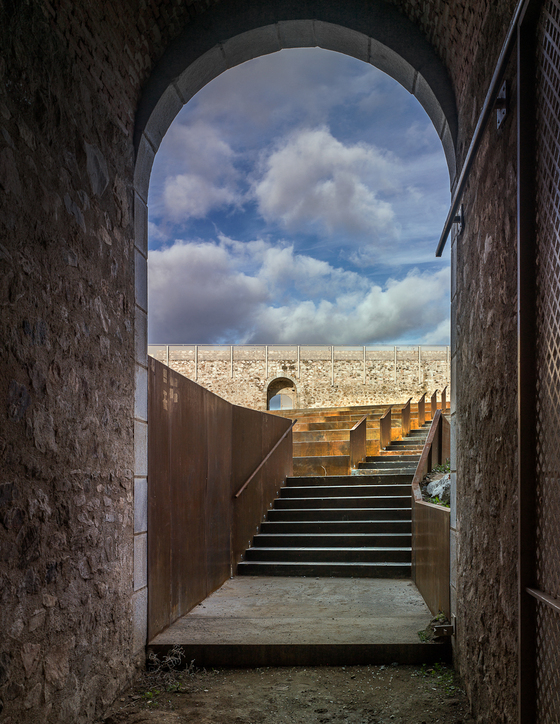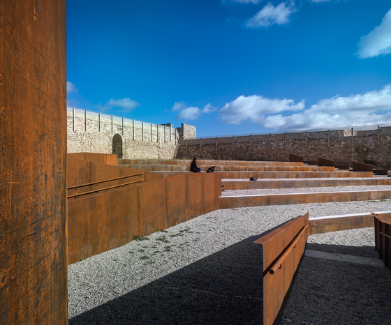 Más allá de “descarnado”, el vacío del interior del castillo cubría una notable pendiente que los arquitectos redujeron sirviéndose de una serie de muros de contención de poca altura que, además de romperla, organizan las rampas y las nuevas terrazas, es decir, el acceso universal y la posibilidad de usos paralelos en el mismo recinto. De este modo, al tiempo que hacían accesible el nuevo lugar de encuentro lo transformaban fragmentándolo para que pudiera utilizarse con distintas actividades. Romper fue, así, una primera decisión. Utilizar la pendiente para esa fractura y para las rampas, la segunda. ¿Ha perdido o ha ganado el patio? Los arquitectos aconsejan responder a esa pregunta pensando en la gente, que ahora tiene ese espacio de encuentro que, a la vez, hace posible la relación y la contemplación del parque y del paisaje desde diversas alturas y, por lo tanto, desde varios puntos de vista.