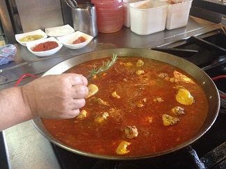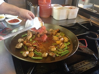 Las fotografías que siguen hablan mejor que mis palabras. Salteado inicial de las carnes y las verduras, adición de agua, hervor prolongado con algunas hebras de azafrán y por último incorporación del arroz que por supuesto no se sofríe. Como siempre, todo depende del punto y de las proporciones. Algo que García controla al milímetro.
