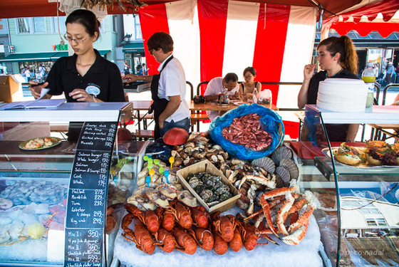 El fondo del Bryggen sigue ocupándolo el mercado del Pescado, antigua lonja al aire libre donde hoy varias docenas de quioscos ambulantes siguen ofreciendo salmón ahumado y marinado, filetes de ballena (pese a la controversía y el rechazo que suscita su caza, en Noruega se considera un alimento tradicional y se sigue ofreciendo en restaurantes y pescaderías), anguila, arenques, gambas o bacalao, ya sea para llevar a o para degustar en sus propias mesas.