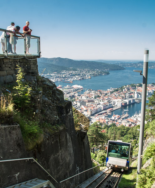 Si el día está soleado (Bergen tiene fama de ser una de las ciudades más lluviosas de Noruega, con una media de 300 días nublados) merece la pena subir en el Fløibanen, el funicular que parte justo a un lado del mercado del Pescado hasta la colina de Fløyen, donde un mirador descubierto ofrece unas vistas majestuosas de la ciudad, del Bryggen, de las instalaciones portuarias más modernas y del laberíntico entramado de fiordos e islas que protegen la rada y que hicieron de Bergen uno de los puertos más seguros de la costa noruega sin necesidad de gastar una corona en ladrillos con los que levantar diques y rompeolas.