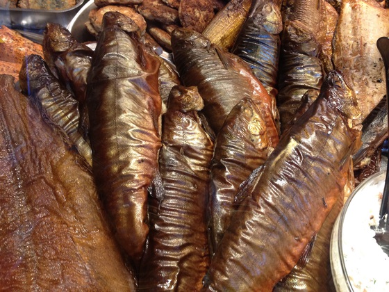Yo sabía que los ahumados en caliente son una forma de asado y se aplican a pescados enteros. Sin embargo, me apuntó que su marido modificaba la receta en función de la especie y el tamaño de cada pieza. Normalmente dos horas en horno de ahumar a 60ª C y tres horas más a 90ºC. Doy fe que estos asados a relativa baja temperatura son espléndidos. Sobre todo con las grandes truchas árticas y el halibut (fletán), donde las notas de humo son bastante menos agresivas de lo que yo esperaba. También me gustaron las lampreas, con suaves notas de hígado y limo.