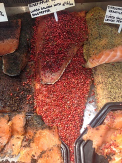 Quien piense que en el norte de Europa los pescados se ahúman en pura rutina se equivoca. Al contrario, se tratan con recetas distintas, algunas particularmente refinadas. Se marinan y se preparan en salmuera, se ahúman en frío o en caliente, se flamean y hasta se pasan por la parrilla con pan rallado o se fríen. Aparte del típico gravlax de origen sueco, salmón curado en sal, azúcar y eneldo, me encontré con salmones marinados a la pimienta negra y limón y, también, a la pimienta rosa. Deliciosos.