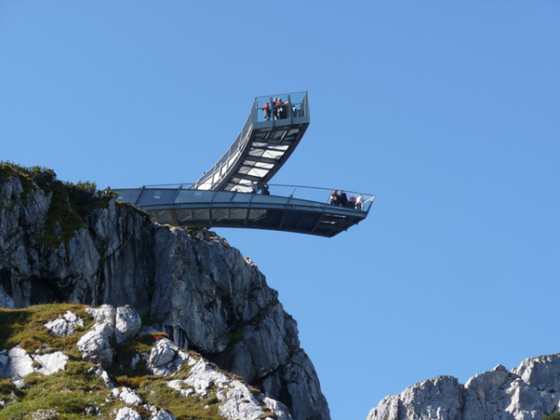 Dos grandes vigas de acero se cruzan sobre un vacío de mil metros para crear este mirador turístico en el valle de Höllental. Se localiza en Osterfelderkopf, a 2.080 metros de altura, y tiene acceso desde la estación superior del Osterfelderbahn.