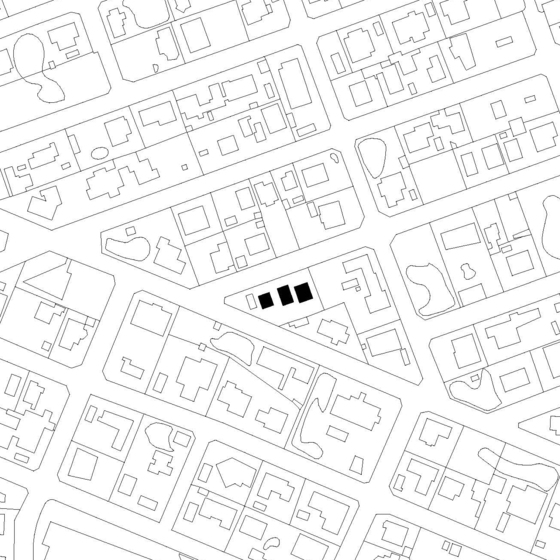 Los arquitectos propusieron tres cajas esparcidas por el solar, casi alineadas y arrimadas a norte para dejar libre la zona exterior más amplia en el sur. La primera caja, al este, contiene la zona de los hijos, con tres dormitorios individuales en la primera planta y un estudio común en la planta baja. La segunda, el volumen central, alberga el corazón de la casa: la cocina y sala grande y alta (cuatro metros de altura) con una chimenea. La tercera caja, al oeste, contiene la zona de los padres. Desde su dormitorio casi se toca el jardín.