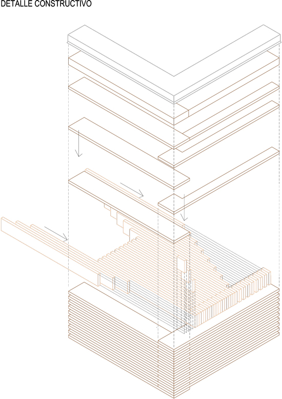 Los arquitectos levantaron un depósito apilando lamas de madera de pino sin tratar para poder incorporar el propio contenedor al processo de compostaje como paso final. Así, el 90 % de esta arquitectura efímera terminará convertida en abono. Se salvan los prefabricados de hormigón (como los empleados en las aceras para hacer los bordillos) sobre los que se fueron apilando, protegidas por bandas de neopreno para evitar la humedad, las lamas de madera.