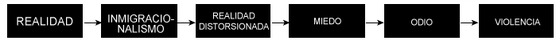 Inmigracionalismo es un término que la ONG ha creado para referirse al fenómeno de unir inmigración y sensacionalismo en la prensa, es decir, cuando se produce una manipulación informativa en los medios para generar odio, miedo o confusión. Resumen el fenómeno en este esquema: