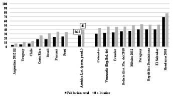 La reducción de la pobreza, la indigencia y la desigualdad en la distribución del ingreso que ha experimentado la mayor parte de los países de la región no ha permitido, empero, acortar otras brechas que históricamente han definido algunos de los perfiles más notorios de la región. Así, las asimetrías con relación al ingreso y, por ende, al riesgo de caer en situación de pobreza entre grupos étnicos, áreas geográficas (el mundo rural versus el urbano), grupos de edad y género se mantienen desafiantes en la región. Como se puede apreciar en el Gráfico 4, en todos los países de la región (al menos en los 18 sobre los que se presenta información) la incidencia de la pobreza en los niños y adolescentes menores de 15 años es claramente mayor que en el conjunto de la población.