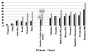 Los datos presentados en el Gráfico 6 muestran la persistencia de esta asimetría o disparidad entre áreas rurales y urbanas. Al mismo tiempo resulta interesante señalar que en los países con más bajos niveles de pobreza y, a la vez, mayores índices de urbanización, se constata una mayor incidencia de la pobreza en las áreas urbanas que en las rurales (Uruguay y Chile) o, a lo sumo, una relativa paridad entre ambas áreas (Costa Rica).