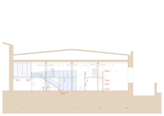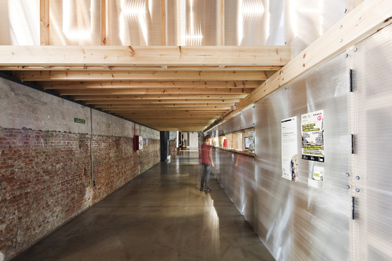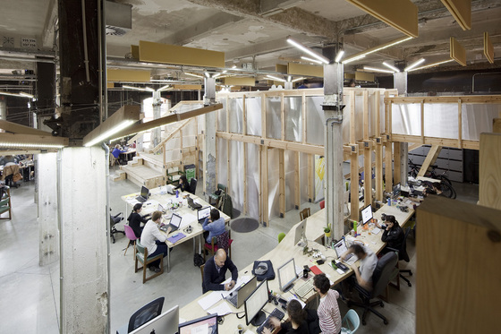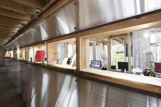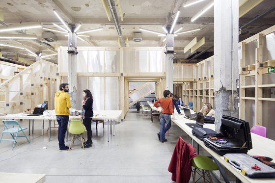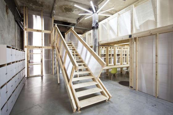 La intervención se beneficia de la magnífica escala y hechuras del antiguo matadero del barrio de Legazpi, pero no busca potenciar la estética póvera sino, al contrario, trabajar con pocos medios para poder existir. Así, estas oficinas en las que se puede alquilar espacio de co-working para start ups, están realizada con apenas dos materiales: pino sin tratar y policarbonato multicapa. El primero sirve tanto para levantar una estructura interna (que separa dos pisos, levanta unas gradas y divide horizontalmente el espacio) y el segundo envuelve el proyecto y aísla visualmente las estancias.